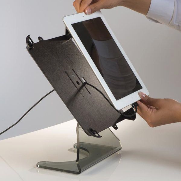 iPad can be placed in the stand easily and is secured with 2 tamper proof screws provided with this adjustable ipad stand to reduce the risk of theft or falling down.